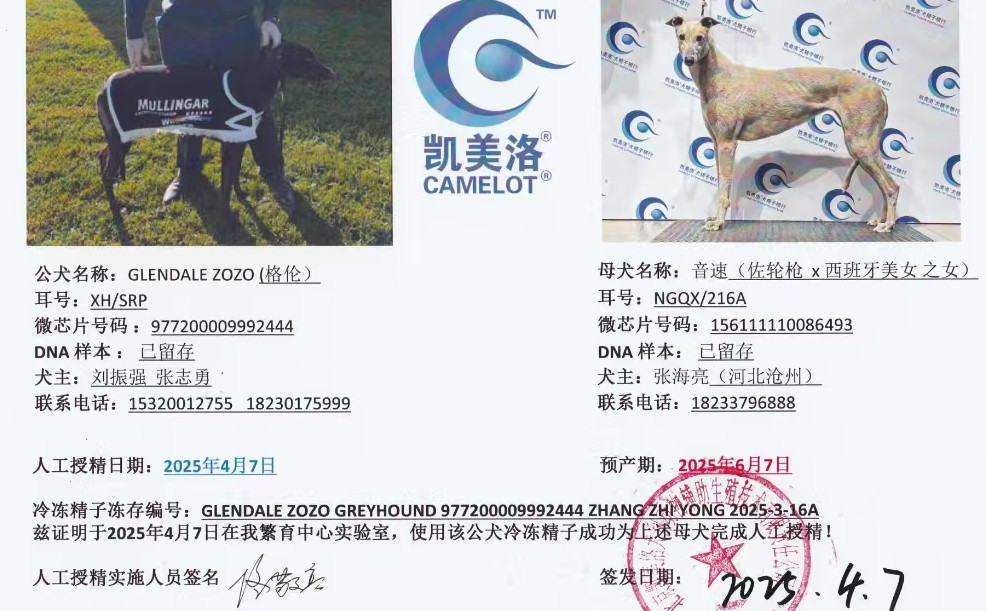 格伦X音速 2025年4月7日海兴张海亮的格力犬种母音速使用沧州张志勇的格力犬种公格伦人工授精 | 格伦 Glendale Zozo | 布罗德斯特兰德博诺 Broadstrand Bono | 坠落的悉尼 Droopys Sydney | 特别公爵Duke Special |