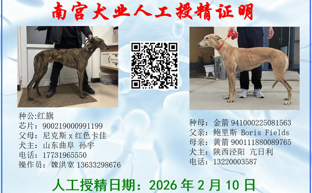 红旗X金箭 2026年2月10日泾阳亢日利的格力犬种母金箭使用曲阜孙宇的格力犬种公金箭人工授精 | 红旗 900219000991199 | 尼克斯 RF Nix | 和所有 KC and All | 盖博-道奇Gable Dodge |