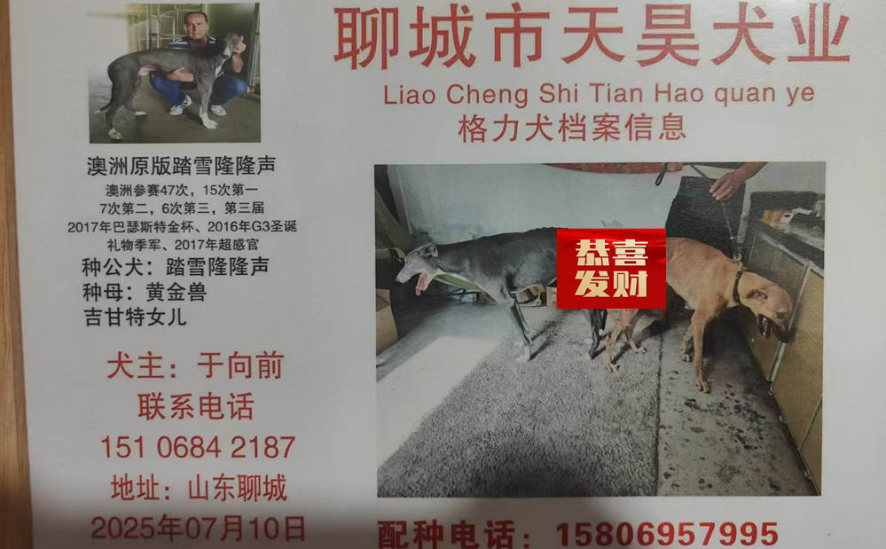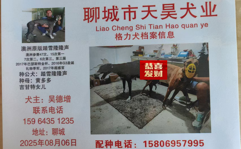踏雪隆隆声 Better Call Sloy 2014年12月5日出生于澳大利亚,GRV记载47次参赛15次第一、7次第二、6次第三,总奖金53630澳币,第三届2017年巴瑟斯特金杯;2016年G3圣诞礼物季军,2017年超感官,2018年4月落户济宁刚子犬舍,2019年7月落户章丘张清处,2020年5月落户聊城郭天宝处 | 宇宙隆隆声 Cosmic Rumble | 螺旋形尼基塔 Spiral Nikita | 幻影闪现 Phantom Flash | 浮华的先生Flashy Sir |