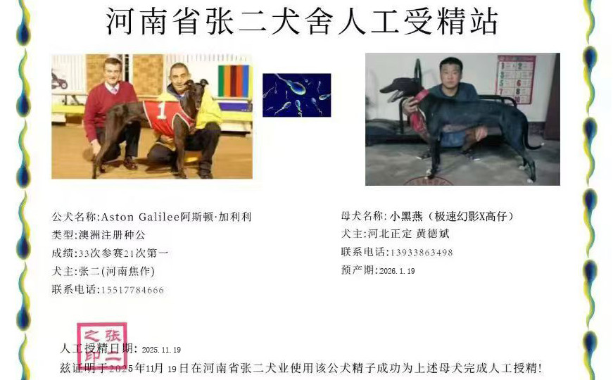 阿斯顿加利利X小黑燕 2025年3月1日正定黄德斌的格力犬种母小黑燕使用焦作张二的格力犬种公阿斯顿加利利人工授精,并于2025年5月2日产下7条,4公3母 | 阿斯顿加利利 Aston Galilee | 夸大的设拉子 Bombastic Shiraz | 黑设拉子 Black Shiraz | 金杰Ginger |