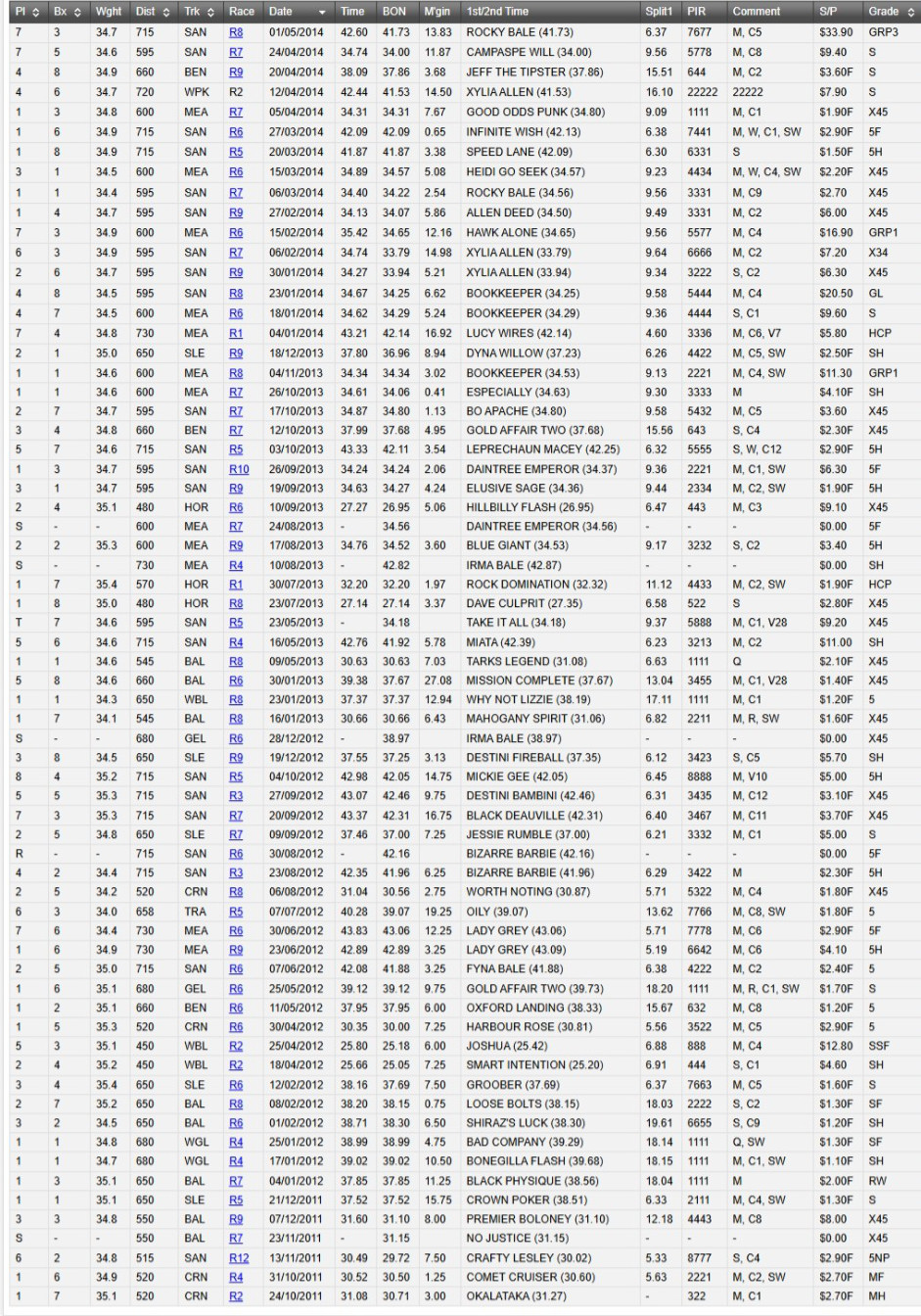夸大的灵魂 Alpe D'Huez 2010年2月4日出生于澳大利亚,GRV记载61次参赛23次第一、10次第二、7次第三,总奖金196785澳币,2次参加G1级别比赛获得冠军一次,2012年1月17日以39.02秒打破Warragul赛道680米记录,并于2012年1月25日以38.99秒打破自己刚刚创下的赛道记录,2014年9月落户辽中高闯处,2018年6月落户聊城郭天宝处
