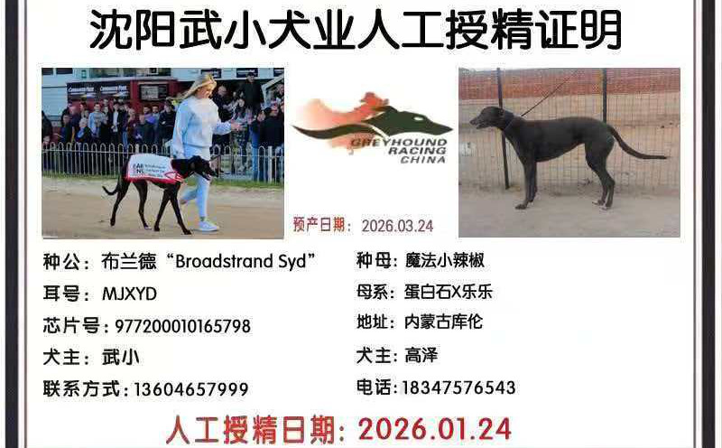 布兰德X魔法辣椒 2026年1月24日格力犬种母魔法辣椒使用武小的格力犬种公布兰德人工授精(注:此窝由库伦旗高泽繁殖) | 布兰德 Broadstrand Syd | 坠落的悉尼 Droopys Sydney | 特别公爵 Duke Special | 巴利马克梅芙Ballymac Maeve |