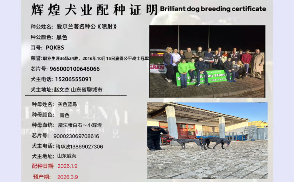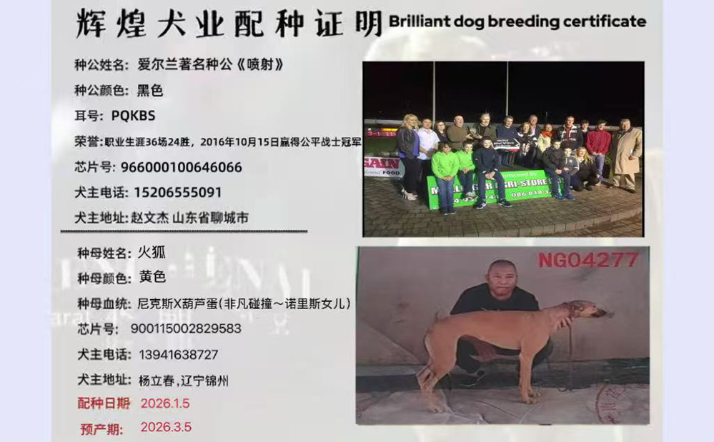 喷射 YY4555 2014年8月16日出生于爱尔兰,职业生涯36场24胜,2016年10月15日赢得公平战士冠军,2019年落户三鑫犬业,2022年5月落户聊城天昊犬业,后落户聊城赵文杰处
