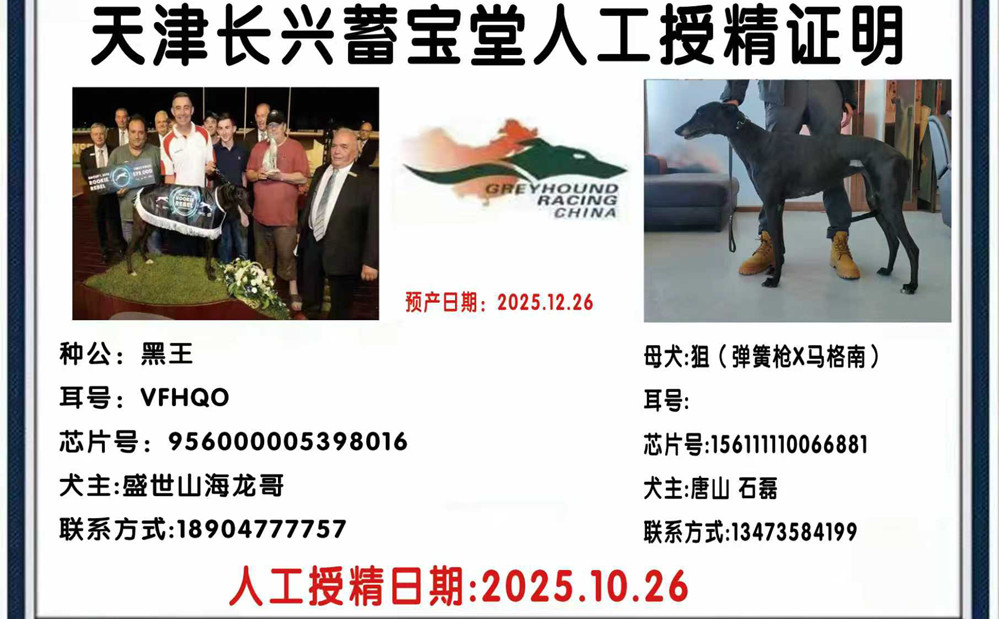 黑王X狙 2025年10月26日唐山石磊的格力犬种母狙使用鄂尔多斯延龙的格力犬种公黑王人工授精 | 黑王 YY7617 | 费尔南多 Fernando Bale | 凯尔索 Kelsos Fusileer | 盖博-道奇Gable Dodge |