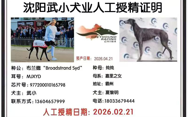 布兰德X纯纯 2026年2月21日霸州夏黎明的格力犬种母纯纯使用武小的格力犬种公布兰德人工授精 | 布兰德 Broadstrand Syd | 坠落的悉尼 Droopys Sydney | 特别公爵 Duke Special | 巴利马克梅芙Ballymac Maeve |