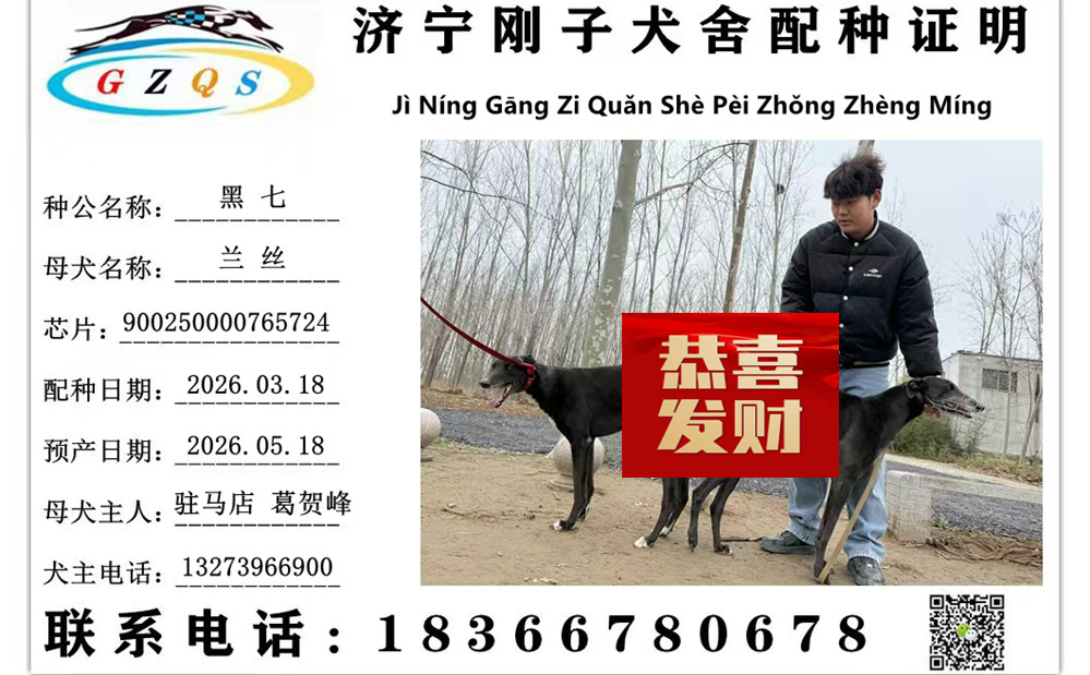 黑七X兰丝 2026年3月18日上蔡葛贺峰的格力犬种母兰丝使用济宁刚子犬舍的格力犬种公黑七配种 | 黑七 900168801110818 | 哈利保持 Harry Keeping | 宇宙隆隆声 Cosmic Rumble | 螺旋形尼基塔Spiral Nikita |