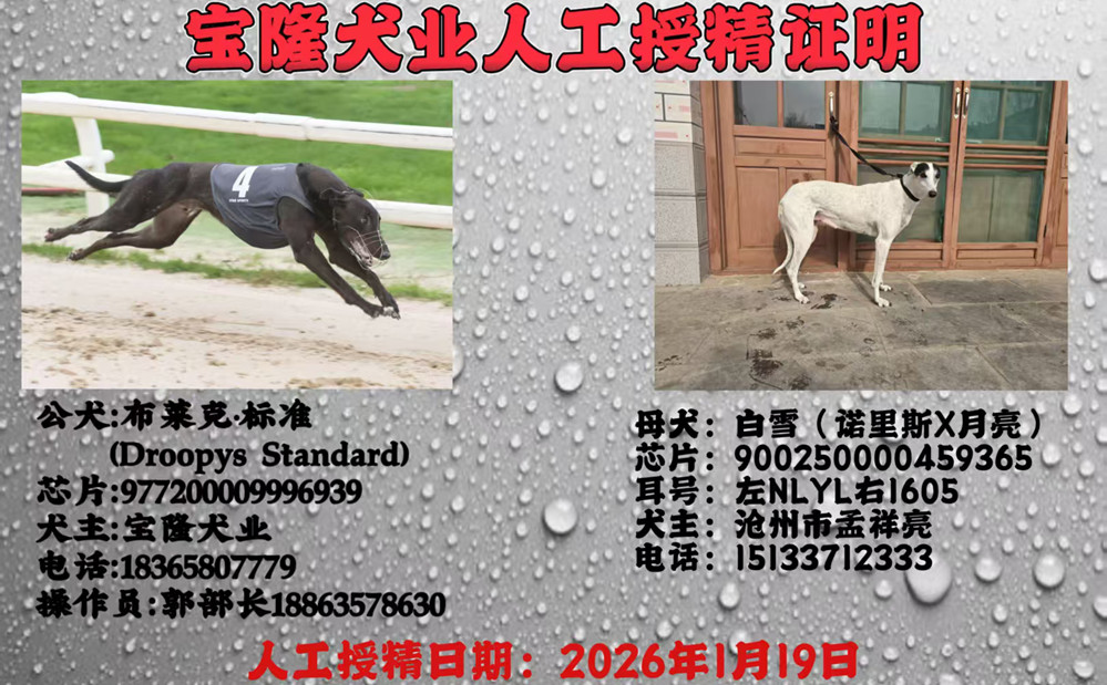 布莱克标准X白雪 2026年1月19日沧州孟祥亮的格力犬种母白雪使用聊城李孔贞的格力犬种公布莱克标准人工授精 | 布莱克标准 Droopys Standard | 笑声黑色 Laughil Blake | 布瑞特李 Brett Lee | 枪法奥斯蒂Gun Law Osti |