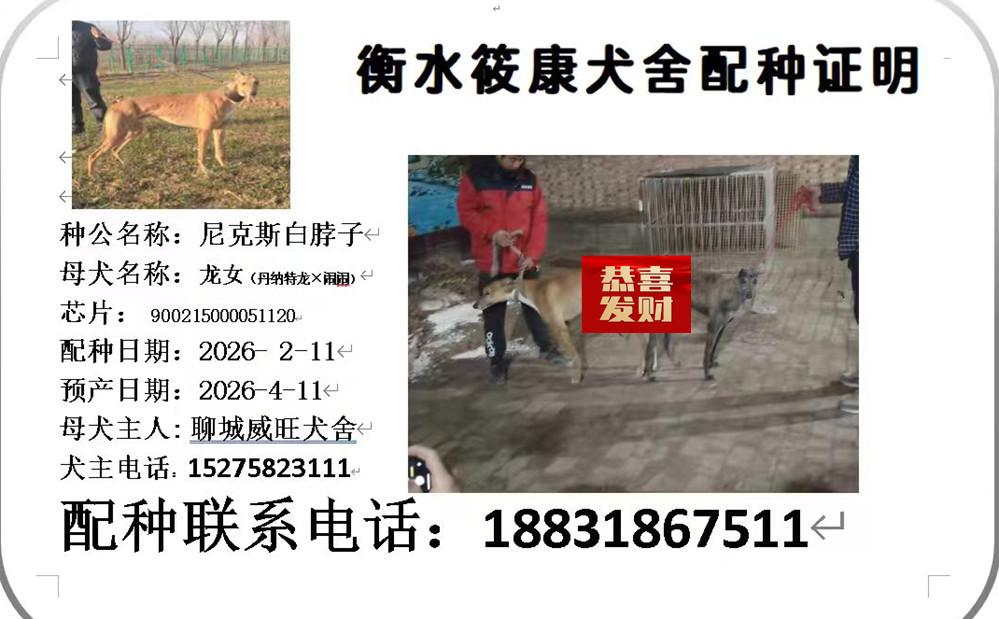白脖子X龙女 2026年2月11日冠县曹春勇的格力犬种母龙女使用衡水刘维康的格力犬种公白脖子配种,并于2026年4月产下12条,7公5母 | 白脖子 900219002829421 | 尼克斯 RF Nix | 和所有 KC and All | 盖博-道奇Gable Dodge |