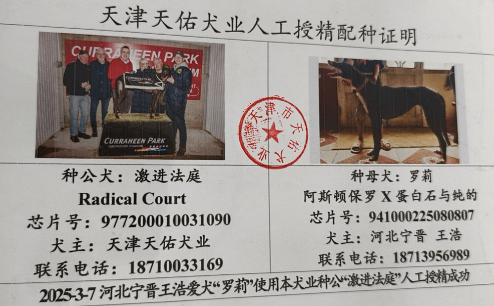 激进法庭X罗莉 2025年3月7日宁晋王浩的格力犬种母罗莉使用天佑犬业的格力犬种公激进法庭人工授精 | 激进法庭 Radical Court | 坠落的悉尼 Droopys Sydney | 特别公爵 Duke Special | 巴利马克梅芙Ballymac Maeve |