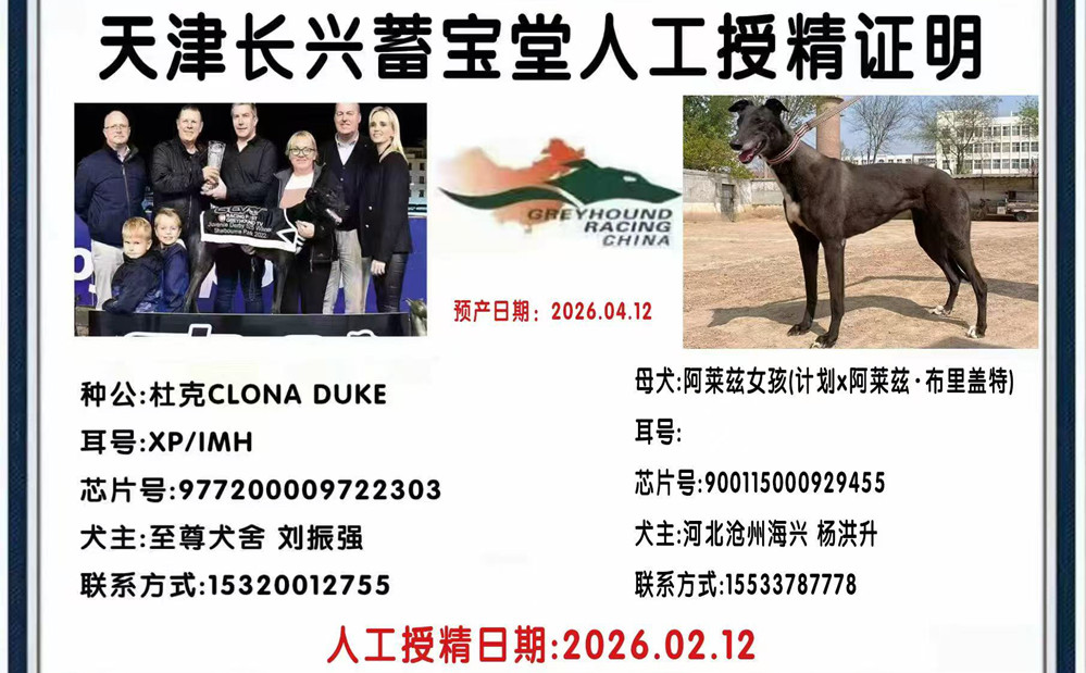 杜克X阿莱兹女孩 2026年2月12日海兴杨洪升的格力犬种母阿莱兹女孩使用至尊犬舍的格力犬种公杜克人工授精 | 杜克 Clona Duke | 玛拉基 Malachi | 明确意见 Definate Opinion | 海浪洛里安Surf Lorian |
