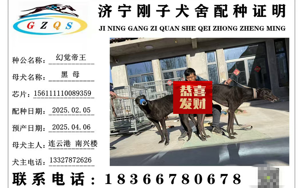 幻觉帝王X黑母 2025年2月5日连云港南兴楼的格力犬种母黑母使用济宁刚子犬舍的格力犬种公幻觉帝王配种 | 幻觉帝王 988000001880105 | 幻觉王子 Bartrim Bale | 使产生幻觉 Hallucinate | 布瑞特李Brett Lee |