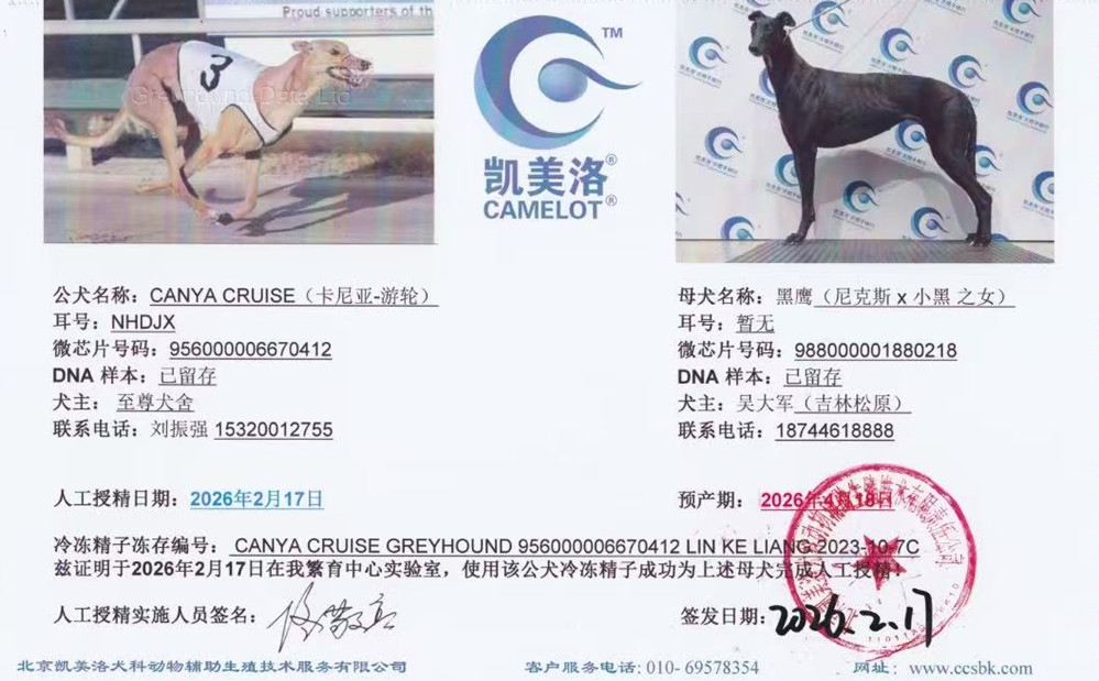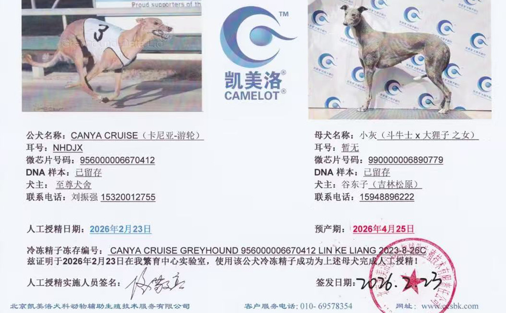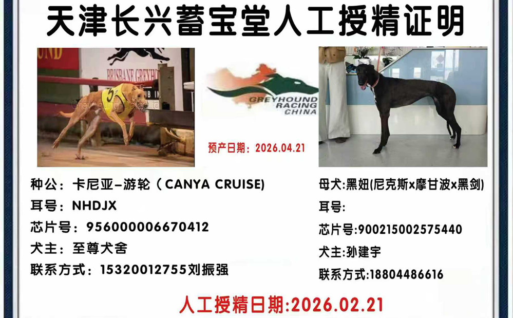 卡尼亚游轮 Canya Cruise 2018年7月9日出生于澳大利亚,GRV记载45次参赛21次第一、4次第二、8次第三,总奖金136915澳元,4次打破赛道记录,2021年4月2日 在Mandurah 405米赛道以22.03秒荣获耶稣受难日杯冠军并打破赛道记录,2021年4月17日在Cannington520米赛道以29.76秒获得G1级别赛事珀斯杯亚军(和冠军同秒),2021年6月落户静海蔺克亮处