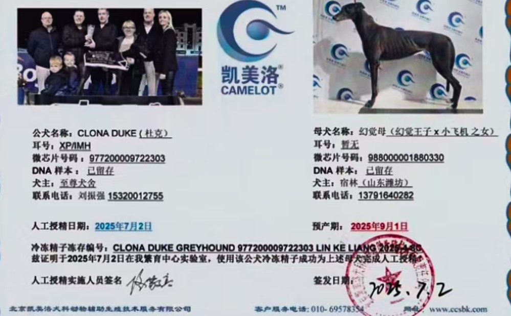杜克X幻觉母 2025年7月2日潍坊宿林的格力犬种母幻觉母使用至尊犬舍的格力犬种公杜克人工授精 | 杜克 Clona Duke | 玛拉基 Malachi | 明确意见 Definate Opinion | 海浪洛里安Surf Lorian |
