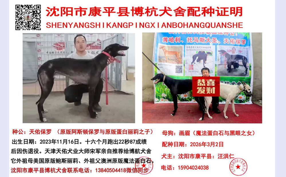 天佑保罗X画眉 2026年3月2日康平汪洪仁的格力犬种母画眉使用康平苏成民的格力犬种公天佑保罗配种 | 天佑保罗 900239912309178 | 阿斯顿保罗 Aston Bolero | 法布雷加斯 Fabregas | 夸大的设拉子Bombastic Shiraz |
