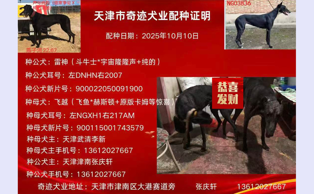 雷神X飞越 2025年10月10日武清李新的格力犬种母飞越使用津南张庆轩的格力犬种公雷神配种 | 雷神 900022050091900 | 斗牛士 Matador Mariah | 盛大先生 El Grand Senor | 哪里的佩德罗Where's Pedro |