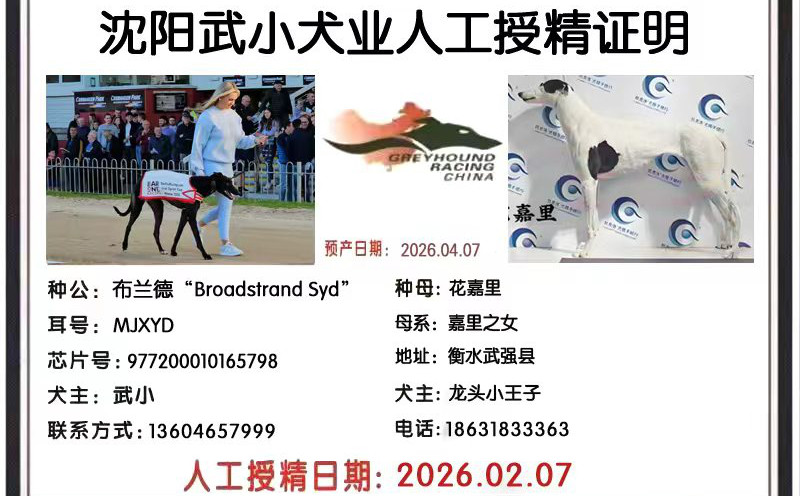 布兰德X花嘉里 2026年2月7日衡水刘先生的格力犬种母花嘉里使用武小的格力犬种公布兰德人工授精 | 布兰德 Broadstrand Syd | 坠落的悉尼 Droopys Sydney | 特别公爵 Duke Special | 巴利马克梅芙Ballymac Maeve |