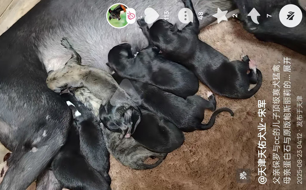 猛禽X蛋白丽莉 2025年6月22日天佑犬业的格力犬种母蛋白丽莉使用天佑犬业的格力犬种公猛禽配种,并于2025年8月23日产下8条 | 猛禽 900023069708675 | 阿斯顿保罗 Aston Bolero | 法布雷加斯 Fabregas | 夸大的设拉子Bombastic Shiraz |