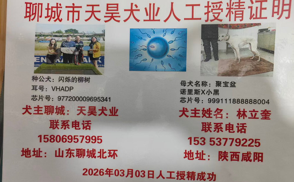 闪烁的柳树X聚宝盆 2026年3月3日咸阳林立奎的格力犬种母聚宝盆使用聊城天昊犬业的格力犬种公闪烁的柳树人工授精 | 闪烁的柳树 Flashing Willow | 笑声黑色 Laughil Blake | 布瑞特李 Brett Lee | 枪法奥斯蒂Gun Law Osti |