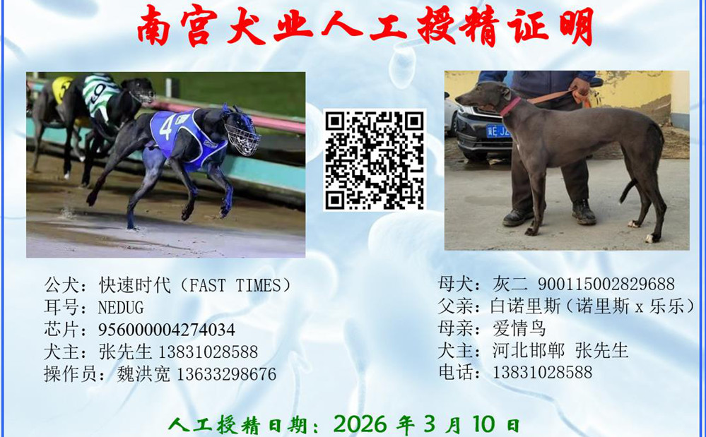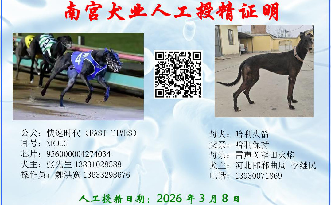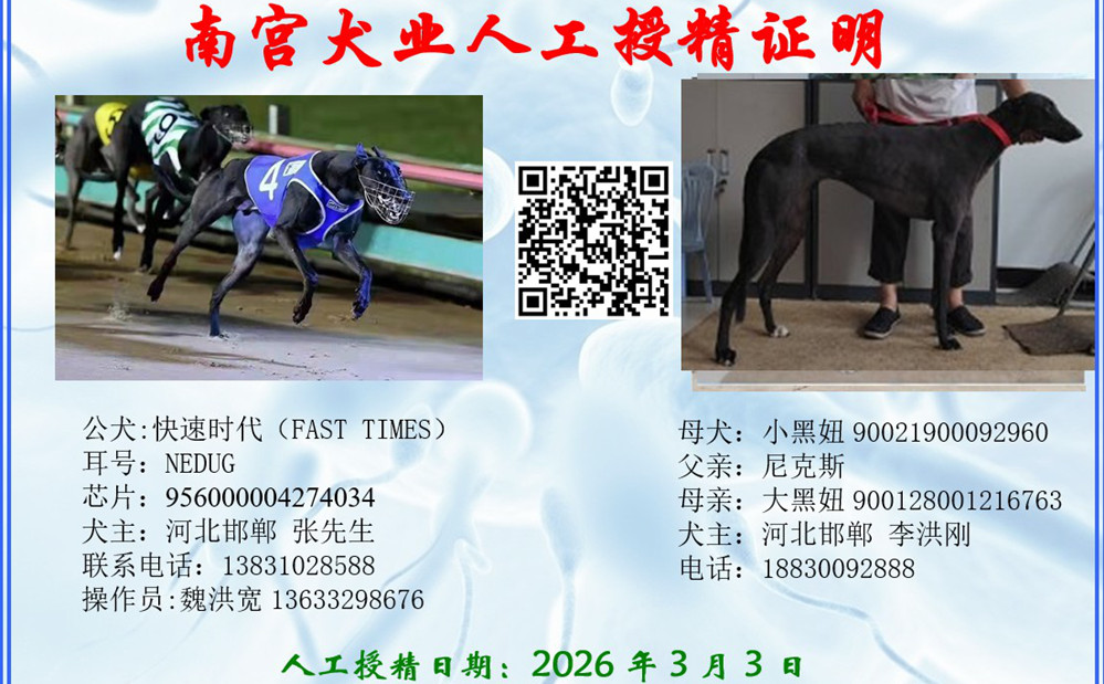 快速时代 Fast Times 2015年4月5日出生于澳大利亚,GRV记载33次参赛16次第一、3次第二、1次第三,总奖金235140澳币,G1级别冬季杯冠军、G1级别布里斯杯冠军、处女系列赛冠军,里兹莫尔赛420米赛道记录,后落户邯郸张志江处