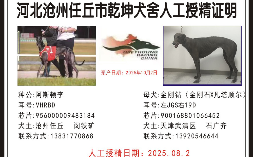 阿斯顿李X金刚钻 2025年8月2日武清石广齐的格力犬种母金刚钻使用任丘闵铁矿的格力犬种公阿斯顿李人工授精 | 阿斯顿李 Aston Lee | 布瑞特李 Brett Lee | 枪法奥斯蒂 Gun Law Osti | 狐狸兄弟Brother Fox |