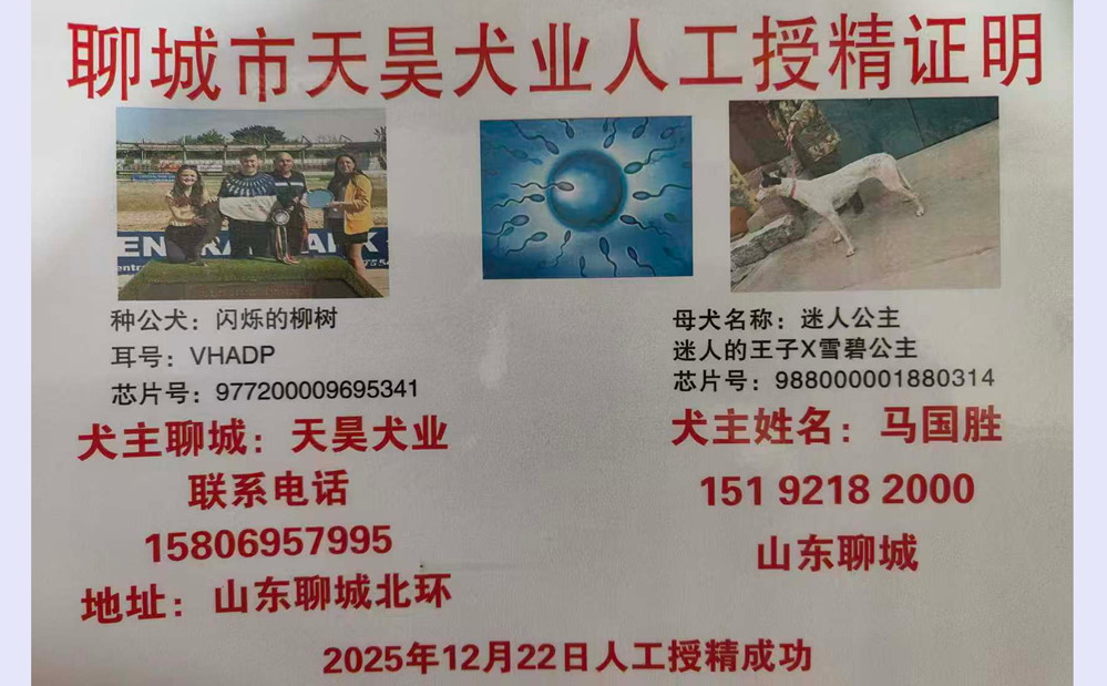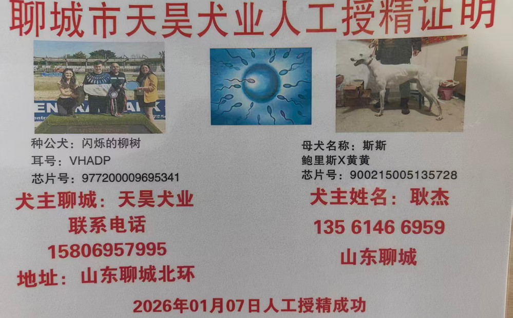 闪烁的柳树X斯斯 2026年1月7日聊城耿杰的格力犬种母斯斯使用聊城天昊犬业的格力犬种公闪烁的柳树人工授精 | 闪烁的柳树 Flashing Willow | 笑声黑色 Laughil Blake | 布瑞特李 Brett Lee | 枪法奥斯蒂Gun Law Osti |