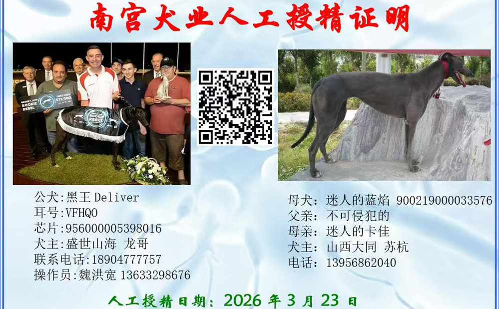 黑王X迷人的蓝焰 2026年3月23日大同苏杭的格力犬种母迷人的蓝焰使用鄂尔多斯延龙的格力犬种公黑王人工授精 | 黑王 YY7617 | 费尔南多 Fernando Bale | 凯尔索 Kelsos Fusileer | 盖博-道奇Gable Dodge |