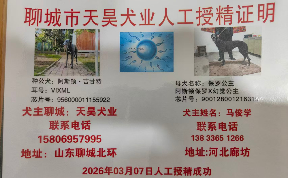 阿斯顿·吉甘特X保罗公主 2026年3月7日格力犬种母保罗公主使用聊城天昊犬业的格力犬种公阿斯顿吉甘特人工授精(注:此窝由马俊学繁殖) | 阿斯顿·吉甘特 Aston Gigante | 和所有 KC and All | 盖博-道奇 Gable Dodge | 棚屋摇晃Wigwam Wag |