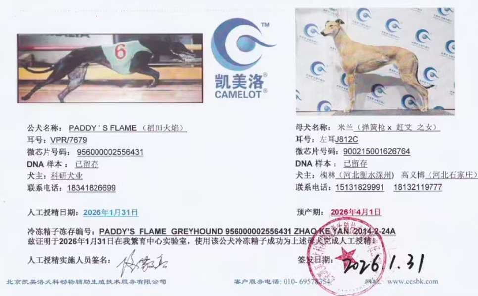 稻田火焰X米兰 2026年1月31日深州小林的格力犬种母米兰使用格力犬种公稻田火焰人工授精 | 稻田火焰 Paddy's Flame | 拉克希尔-乔 Larkhill Jo | 装订工人乔 Staplers Jo | 邓普西-杜克Dempsey Duke |