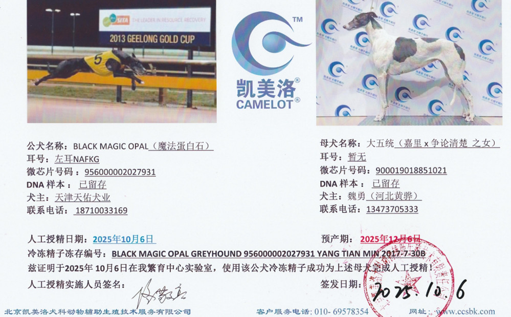 魔法蛋白石X大五统 2025年10月6日黄骅魏勇的格力犬种母大五统使用天佑犬业的格力犬种公魔法蛋白石人工授精 | 魔法蛋白石 Black Magic Opal | 魔法雪碧 Magic Sprite | 布瑞特李 Brett Lee | 枪法奥斯蒂Gun Law Osti |
