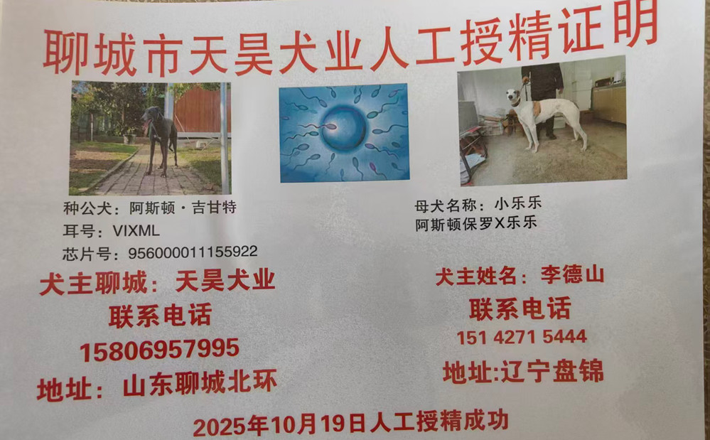 阿斯顿·吉甘特X小乐乐 2025年10月19日盘锦李德山的格力犬种母小乐乐使用聊城天昊犬业的格力犬种公阿斯顿吉甘特人工授精 | 阿斯顿·吉甘特 Aston Gigante | 和所有 KC and All | 盖博-道奇 Gable Dodge | 棚屋摇晃Wigwam Wag |