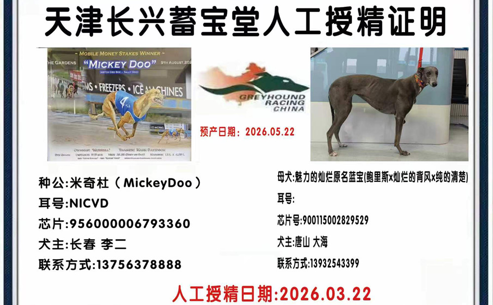 米奇杜X魅力的灿烂 2026年3月22日唐山张椿海的格力犬种母魅力的灿烂使用长春李二的格力犬种公米奇杜人工授精 | 米奇杜 Mickey Doo | 阿斯顿迪比 Aston Dee Bee | 巴西亚贝尔 Barcia Bale | 去掉野性衬衫裤Go Wild Teddy |