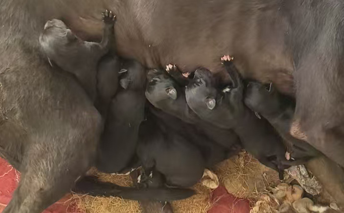 黑王X那天的黑夜 2025年9月18日高阳张永安的格力犬种母那天的黑夜使用鄂尔多斯延龙的格力犬种公黑王人工授精,并于2025年11月产下9条,5公4母