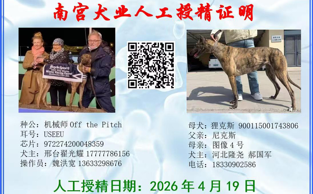 德鲁比·机械师X狸克斯 2026年4月19日隆尧郝国军的格力犬种母狸克斯使用邢台翟光耀的格力犬种公机械师人工授精 | 德鲁比·机械师 Off the Pitch | 坠落的战斗机 Droopys Jet | 柔滑百灵鸟 Slip the Lark | 拉克希尔-乔Larkhill Jo |