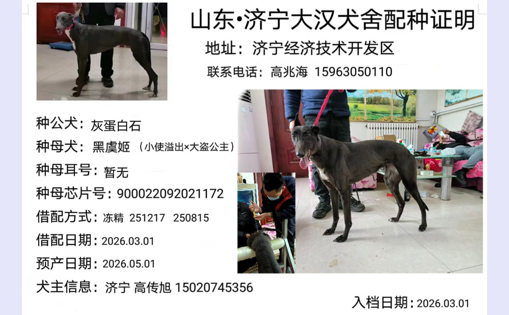 灰蛋白石X黑虞姬 2026年3月1日济宁高传旭的格力犬种母黑虞姬使用济宁唐德峰、高兆海的格力犬种公灰蛋白石人工授精 | 灰蛋白石 941000225081676 | 魔法蛋白石 Black Magic Opal | 魔法雪碧 Magic Sprite | 布瑞特李Brett Lee |