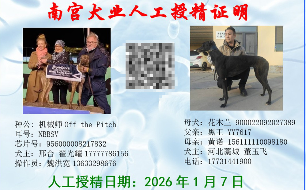德鲁比·机械师X花木兰 2026年1于7日藁城董玉飞的格力犬种母花木兰使用邢台翟光耀的格力犬种公机械师人工授精 | 德鲁比·机械师 Off the Pitch | 坠落的战斗机 Droopys Jet | 柔滑百灵鸟 Slip the Lark | 拉克希尔-乔Larkhill Jo |