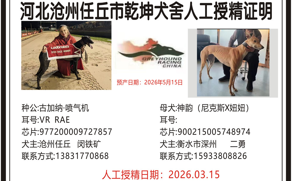 古加纳喷气机X神韵 2026年3月15日深州二永的格力犬种母神韵使用任丘乾坤犬舍的格力犬种公古加纳喷气机人工授精 | 古加纳喷气机 Gougane Jet | 坠落的战斗机 Droopys Jet | 柔滑百灵鸟 Slip the Lark | 拉克希尔-乔Larkhill Jo |