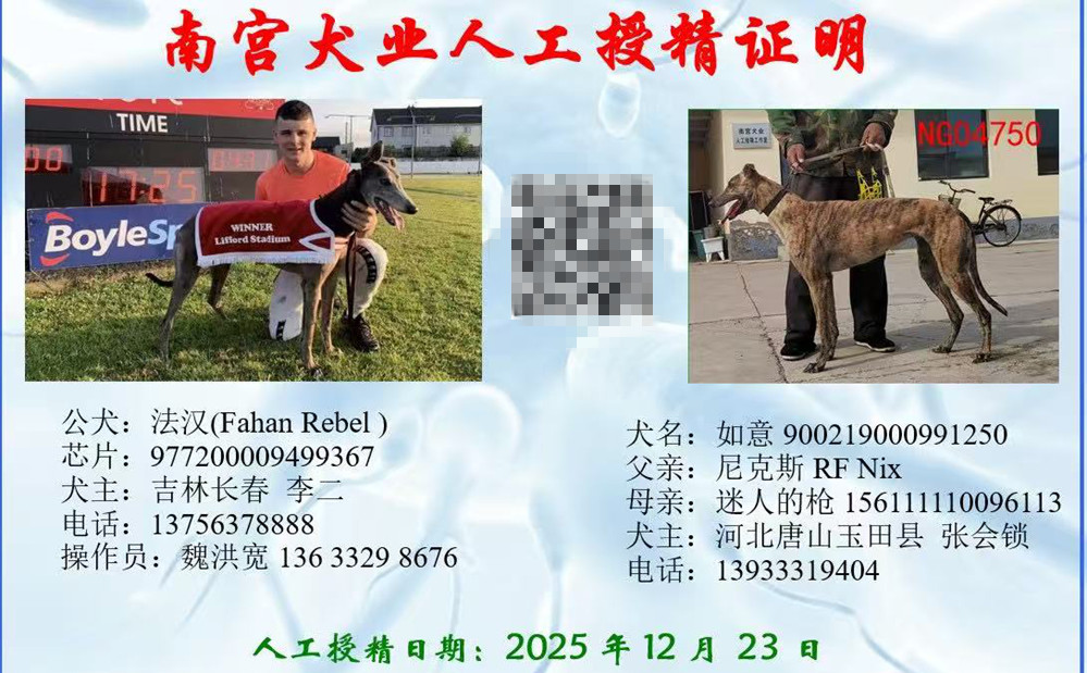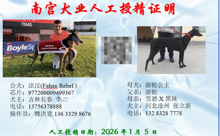 法汉 Fahan Rebel 2020年2月24日出生于爱尔兰,IBG记录20次正式比赛6次第一、4次第二、4次第三,2023年6月4日以17.25秒创造米新297米赛道记录(注:325码=297.18米),2023年8月落户长春李二处