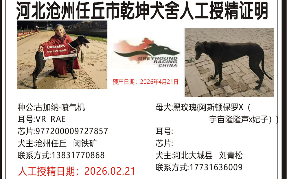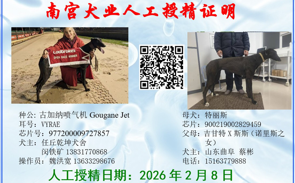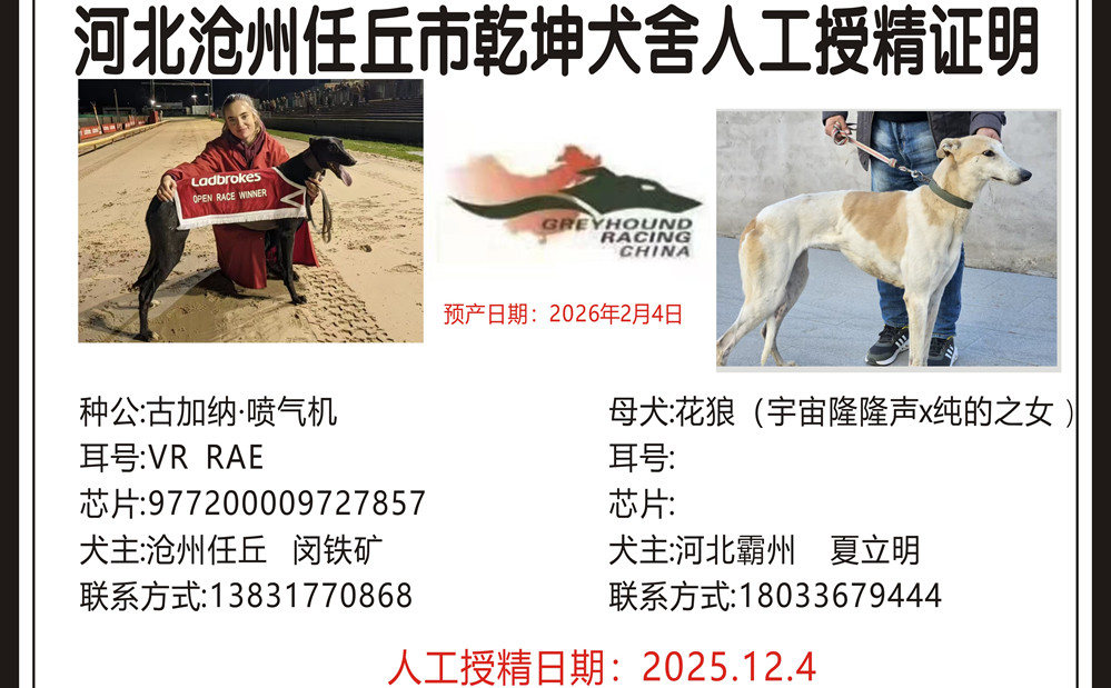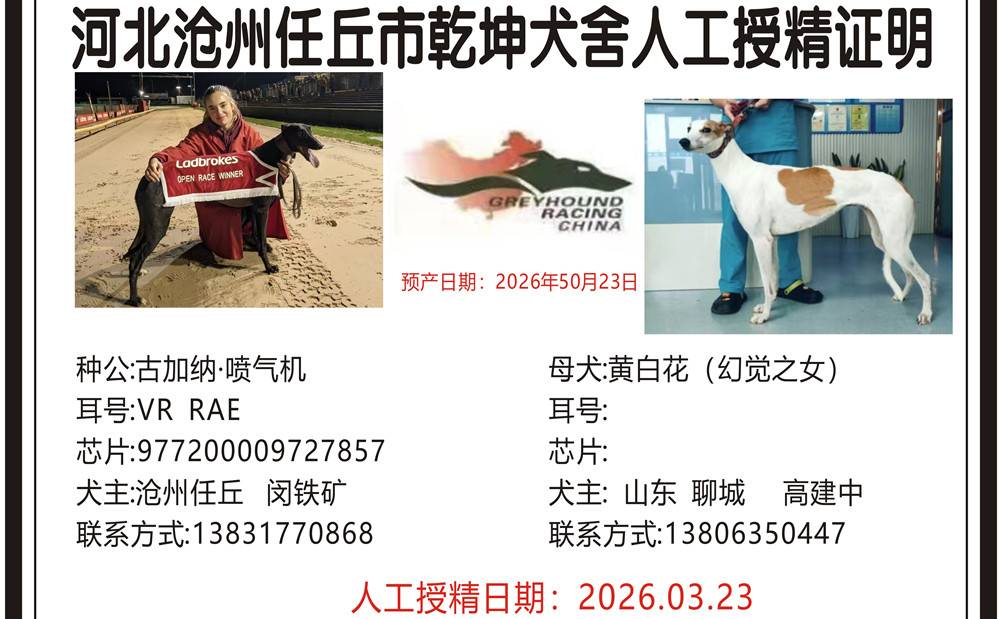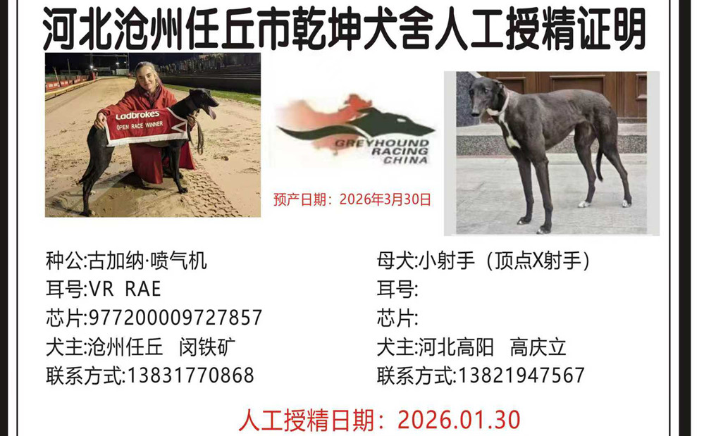 古加纳喷气机 Gougane Jet 2020年8月17日出生于爱尔兰,在爱尔兰参加一场比赛后转战英国赛场,在英国42次参赛29次第一、5次第二、3次第三,2022年10月27日获得OR2级别冲刺金杯冠军并打破佩里巴尔赛道275米记录,2022年12月19日获得OR2级别全国冲刺赛冠军,两次进入OR1决赛,并于2023年6月11日获得OR1级别肯特银盘亚军,另外4次OR3级别冠军4次,2022年度英国最佳短跑格力犬,2023年10月落户任丘乾坤犬舍