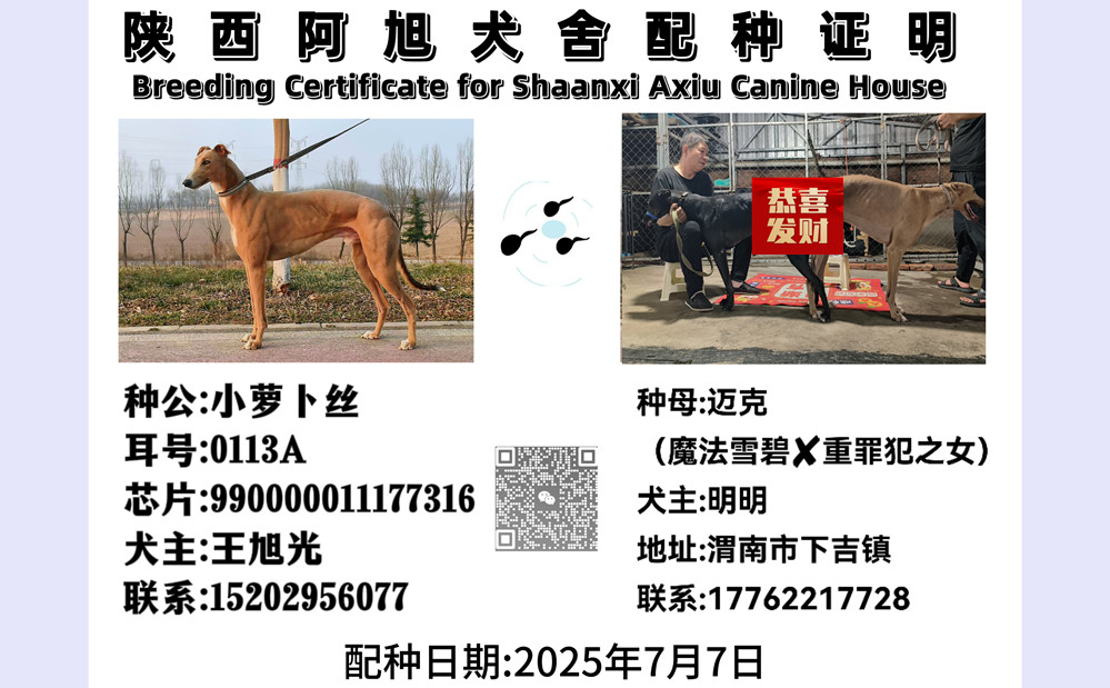 小萝卜丝 990000011177316 鲍里斯X黄黄之子,2020年9月出生于献县王向东处,后落户聊城天昊犬业,后落户西安王旭光处