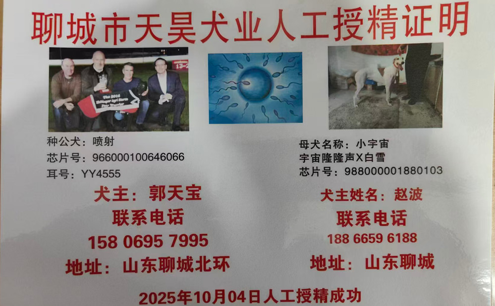 喷射X小宇宙 2025年10月4日聊城赵波的格力犬种母小宇宙使用聊城天昊犬业的格力犬种公喷射人工授精 | 喷射 YY4555 | 坠落的战斗机 Droopys Jet | 柔滑百灵鸟 Slip the Lark | 拉克希尔-乔Larkhill Jo |