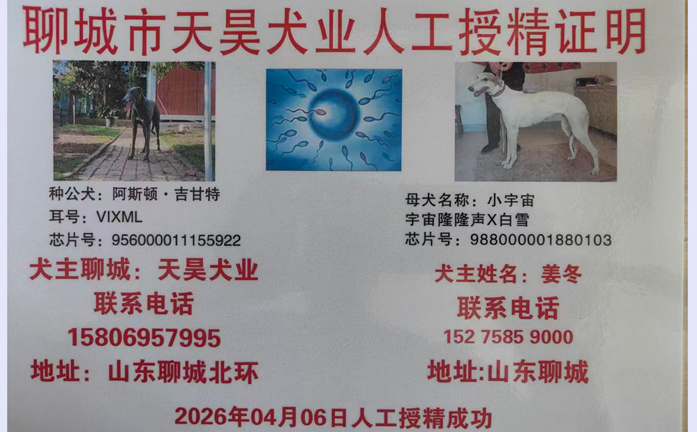 阿斯顿·吉甘特X小宇宙 2026年4月6日聊城姜冬的格力犬种母小宇宙使用聊城天昊犬业的格力犬种公阿斯顿吉甘特人工授精 | 阿斯顿·吉甘特 Aston Gigante | 和所有 KC and All | 盖博-道奇 Gable Dodge | 棚屋摇晃Wigwam Wag |