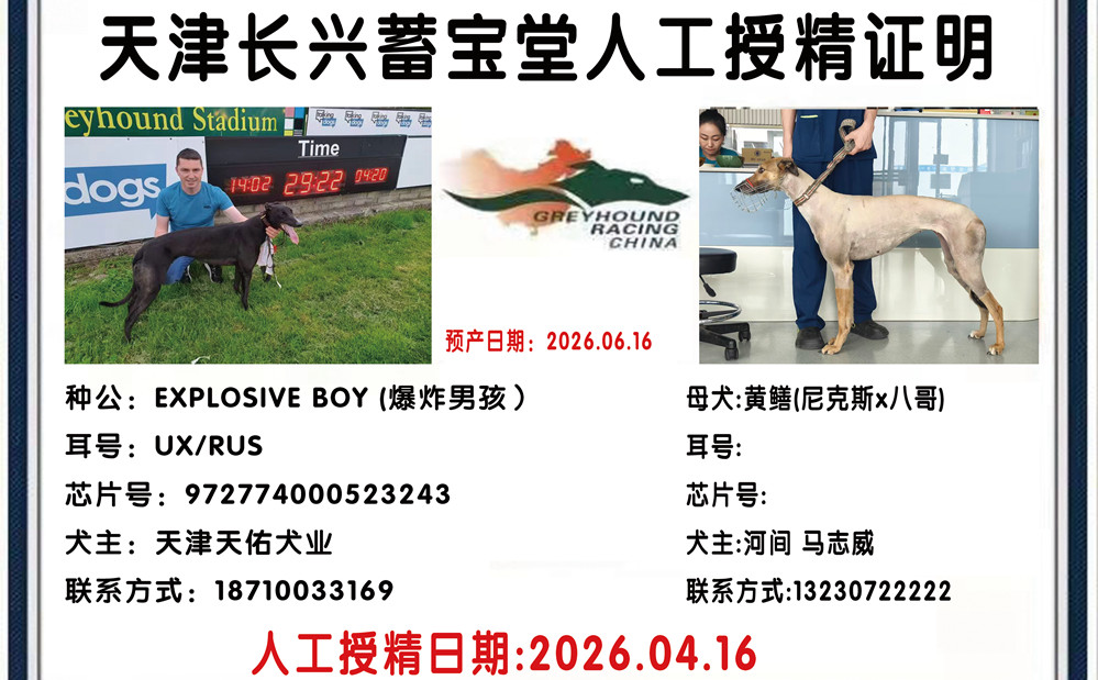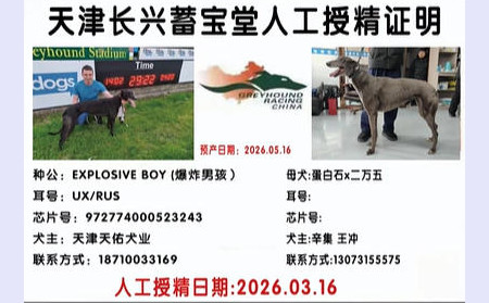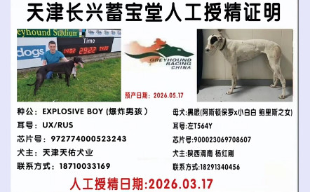 爆炸男孩 Explosive Boy 2019年4月3日出生于爱尔兰,职业生涯42场正式比赛23次第一,赢得4次大赛冠军,并且闯入爱尔兰德比决赛,一个赛道记录,荣获2021年爱尔兰年度最佳格力犬公犬,后落户天津天佑犬业